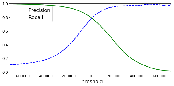 임곗값을 바꾸면서 정밀도와 재현율을 측정해보았을 때 다음과 같은 그래프를 얻을 수 있습니다.