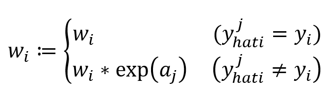 모델이 과소적합한 데이터셋의 가중치는 exp(a_j) 를 곱해주어 가중치를 높힙니다.