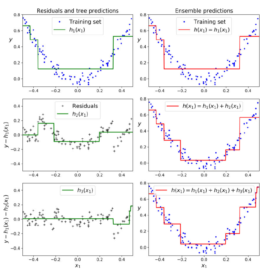 점진적으로 앙상블 예측 -> 잔여오차 구하기 -> 잔여오차 모델 학습 -> 앙상블 학습 -> 앙상블 예측 ... 을 순환하며 학습해나갑니다.