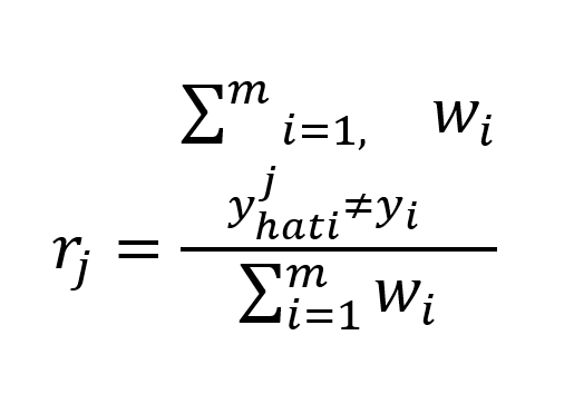 j번째 모델의 가중치는 위와 같습니다. 에러율이 낮을수록 모델의 가중치는 높습니다.