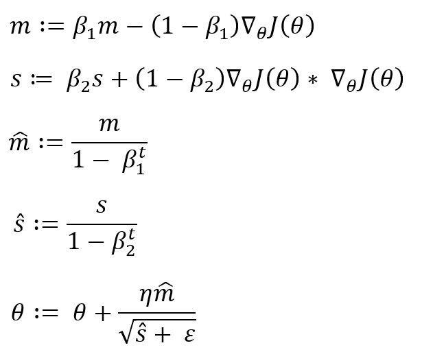 세번째와 네번째 수식은 가장 처음 0으로 초기화되는 m과 s가 0쪽으로 너무 치우치지 않게 증폭시키는 식입니다. t는 반복횟수입니다. 반복횟수가 늘어날수록 더 이상 증폭되지 않을 것입니다.
