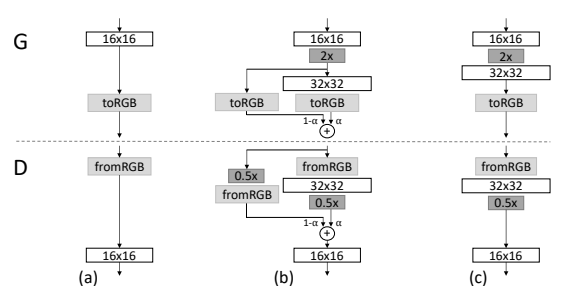 PGGAN에서는 (b)의 구조를 사용하였습니다. alpha값은 학습 도중에 선형적으로 0 to 1로 증가합니다.